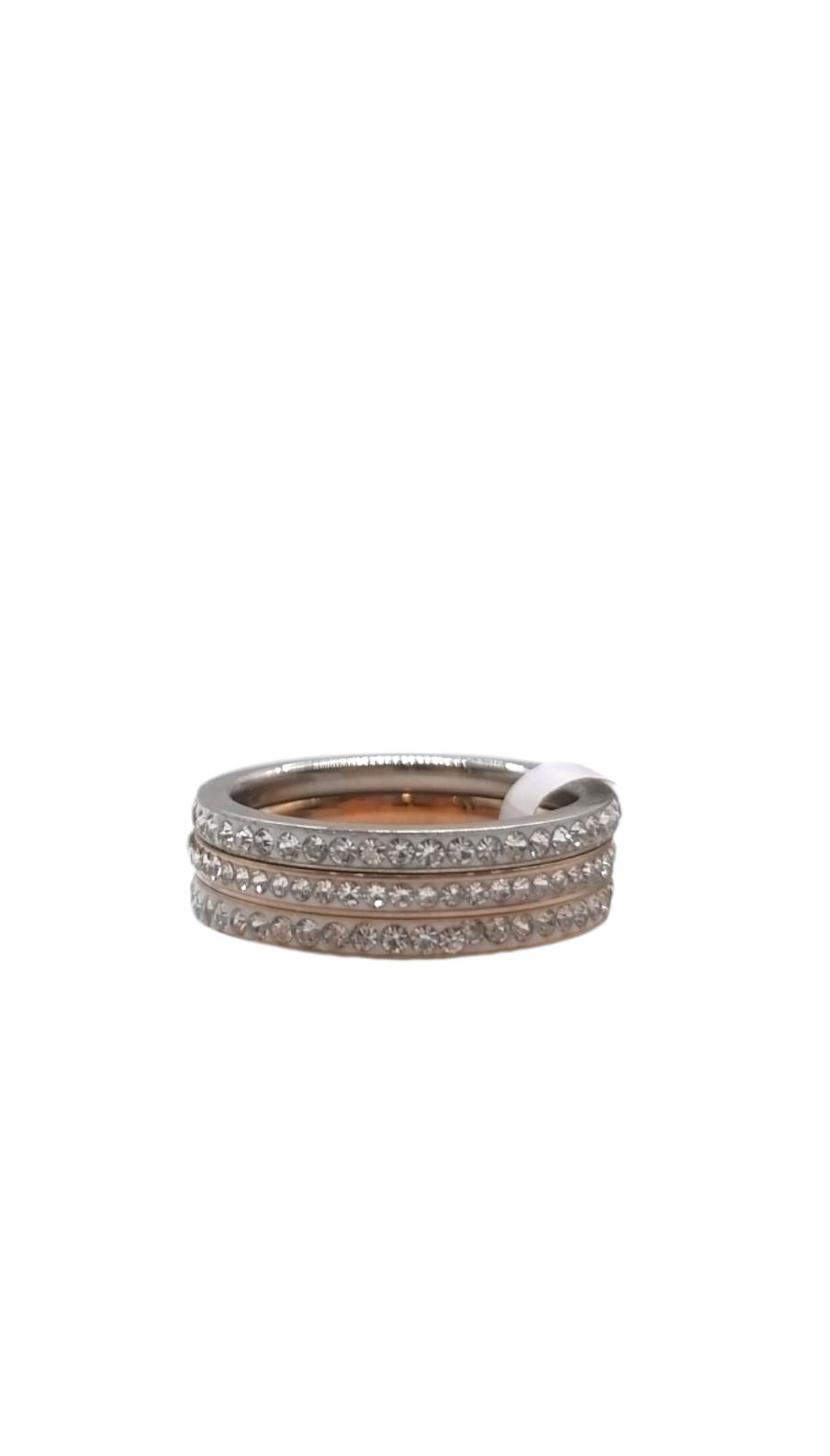 Ατσάλινο τριπλό δαχτυλίδι με ασημί, χρυσό και χρυσό ροζ βεράκια, διακοσμημένα με στρας. Είναι ανθεκτικό σε νερό και δεν μαυρίζει. Όμορφη πρόταση δώρου!