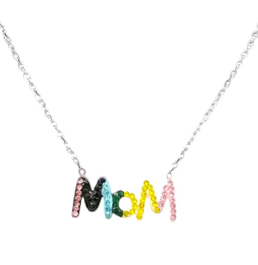 Ατσάλινο κολιέ σε ασημί χρώμα, με μοτίφ “MOM” και πολύχρωμα στρας. Ανθεκτικό σε νερό και άρωμα. Όμορφη πρόταση δώρου!