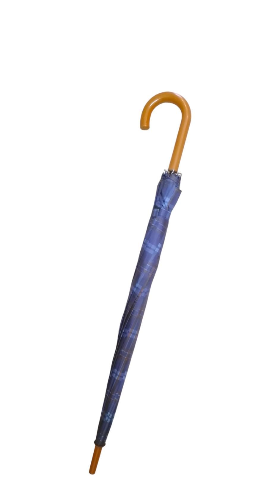 Ομπρέλα μπαστούνι με καρό σχέδιο σε μπλε αποχρώσεις. Είναι ανθεκτική στον αέρα και ανοίγει με αυτόματο μηχανισμό.