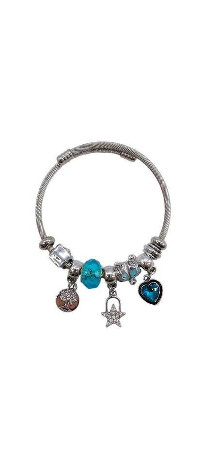 Ατσάλινο βραχιόλι με charms σε ασημί χρώμα. Με μοτίφ καρδούλες, και αστεράκι. Με ρυθμιζόμενο μέγεθος. Όμορφη πρόταση δώρου!