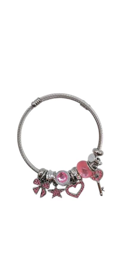 Ατσάλινο βραχιόλι με charms σε ασημί χρώμα. Με μοτίφ φιογκάκι, αστέρι και καρδιά. Με ρυθμιζόμενο μέγεθος. Όμορφη πρόταση δώρου!