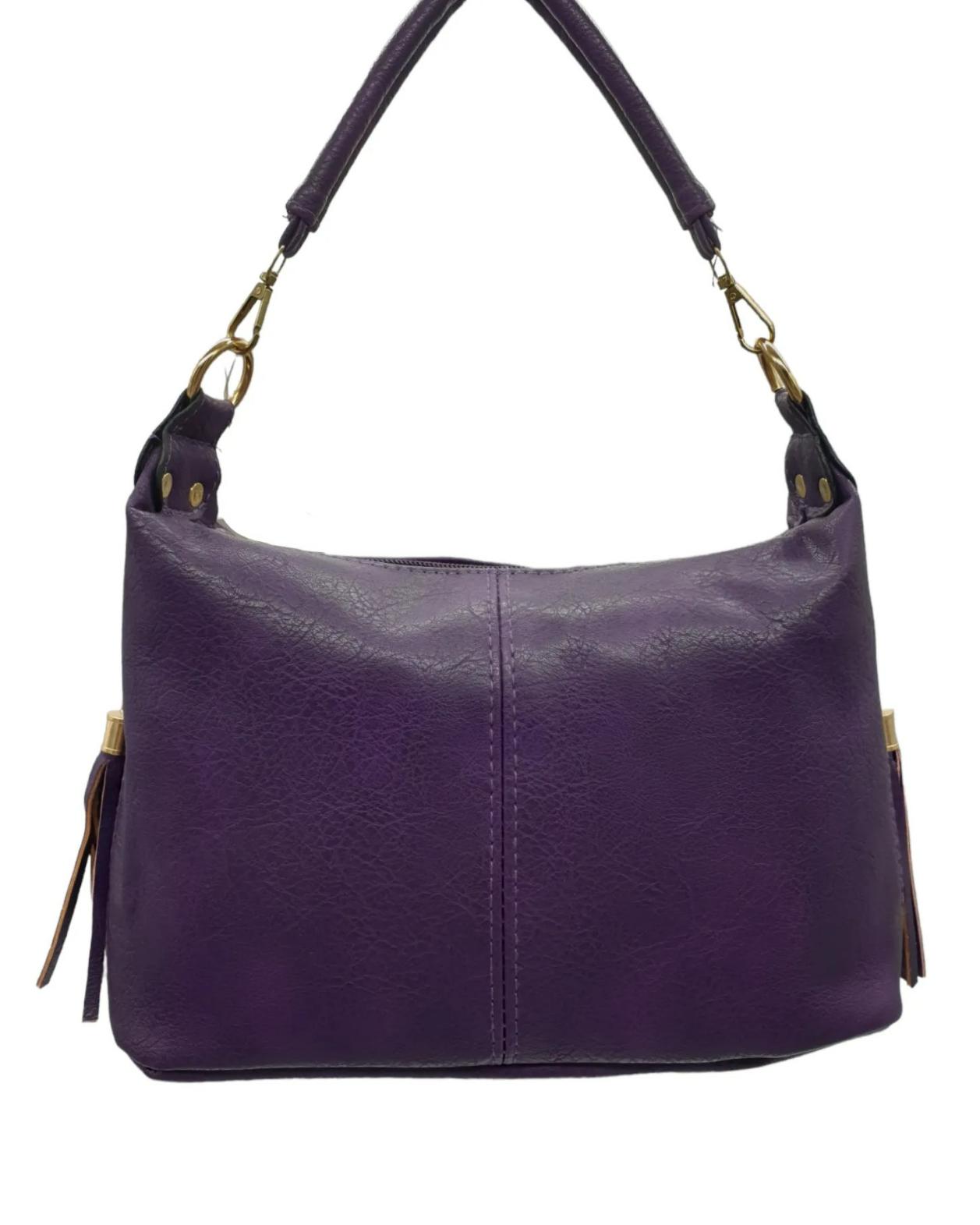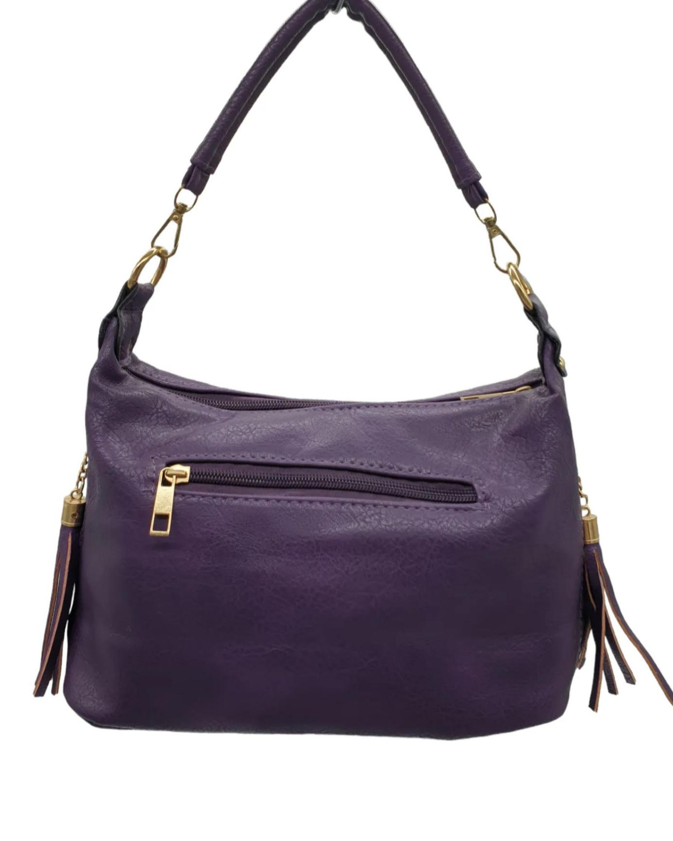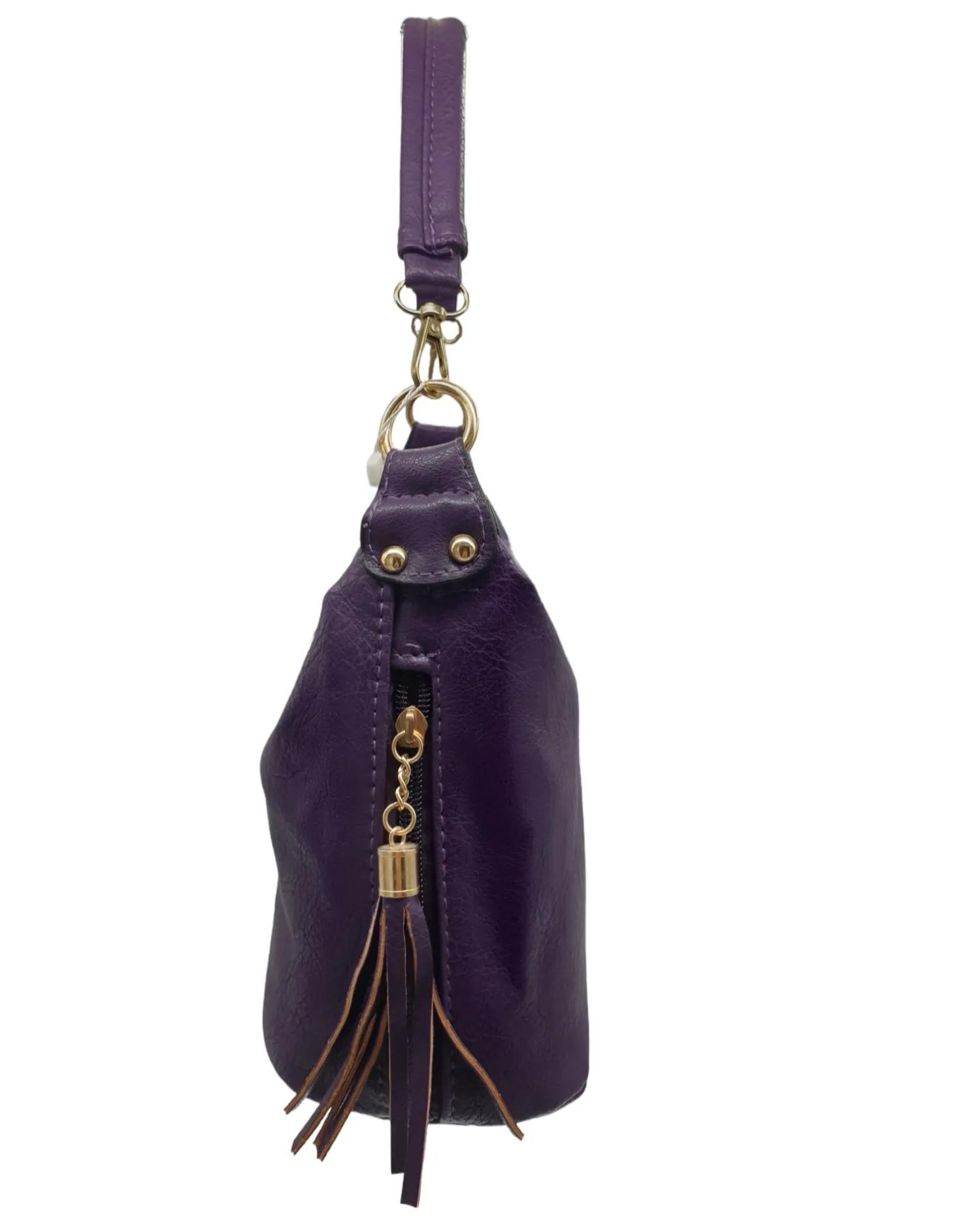 Γυναικεία τσάντα από τεχνόδερμα με διακοσμητικές φουντίτσες στο πλάι. Μπορεί να φορεθεί στον ώμο και χιαστί. Διαθέτει μία μεγάλη κεντρική ευρύχωρη θέση με εσωτερική τσέπη και μια εξωτερική θέση με φερμουάρ στο πίσω μέρος. Με έξτρα αποσπώμενο και ρυθμιζόμενο λουράκι.