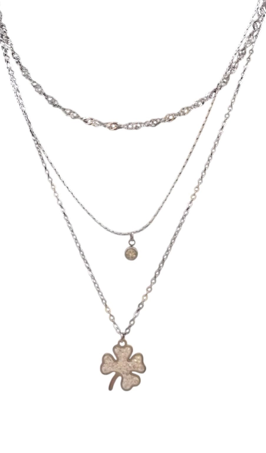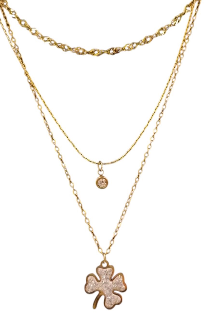 Ατσάλινο κολιέ με τριπλή αλυσίδα σε ασημί και χρυσό χρώμα. Με μοτίφ στρασάκι στη μεσαία αλυσίδα και μοτίφ τριφύλλι με στρας στην τελευταία αλυσίδα. Ανθεκτικό σε νερό και άρωμα. Όμορφη πρόταση δώρου!