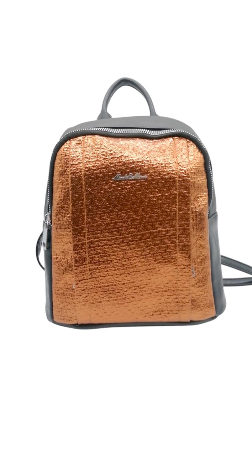 Γυναικείο σακίδιο πλάτης από τεχνόδερμα με στραφταλιζέ μπρονζέ σχέδιο. Διαθέτει μία μεγάλη θέση με φερμουάρ και εσωτερικό τσεπάκι, καθώς και θέση με διπλό φερμουάρ στο μπροστινό μέρος. Ταιριάζει με όλα τα στυλ και προσφέρει άνεση όλες τις ώρες. Με ρυθμιζόμενα λουριά.