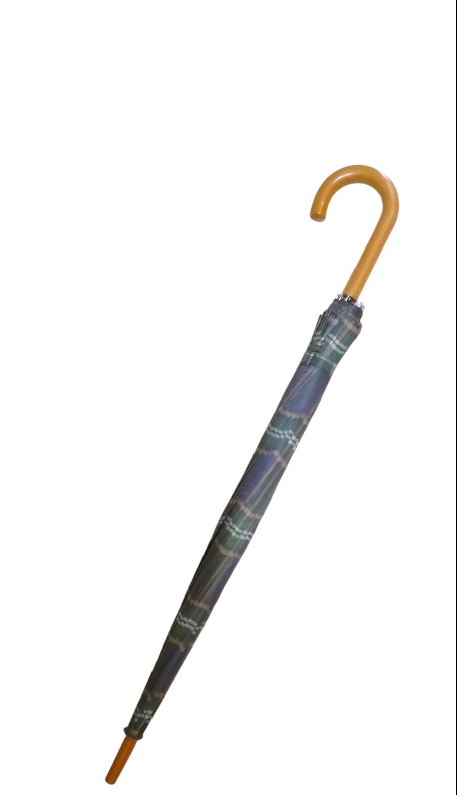 Ομπρέλα μπαστούνι με καρό σχέδιο σε πράσινες και μπλε αποχρώσεις. Είναι ανθεκτική στον αέρα και ανοίγει με αυτόματο μηχανισμό.