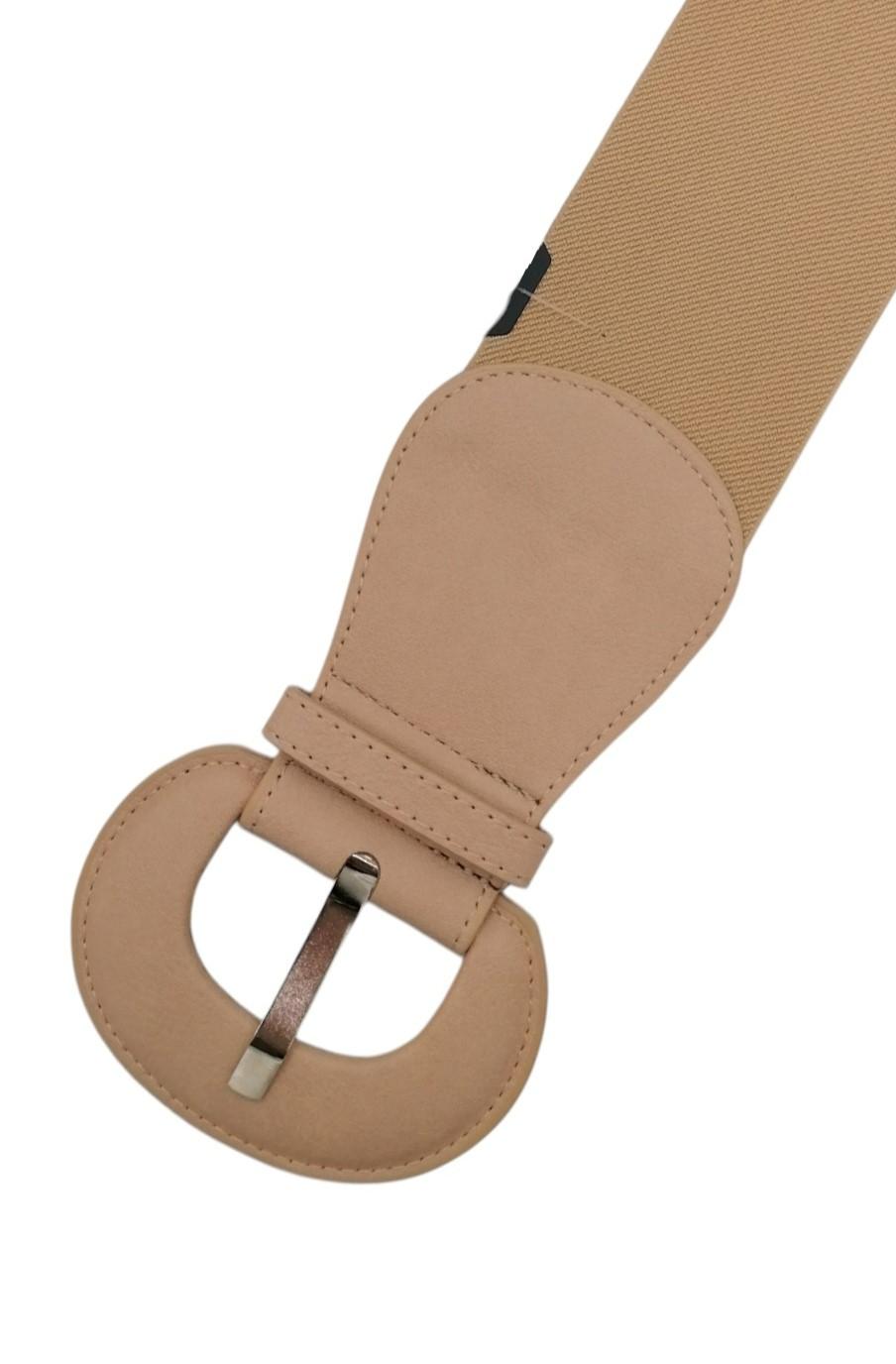 Φαρδιά ελαστική ζώνη με στρογγυλή αγκράφα στο χρώμα της υπόλοιπης ζώνης.